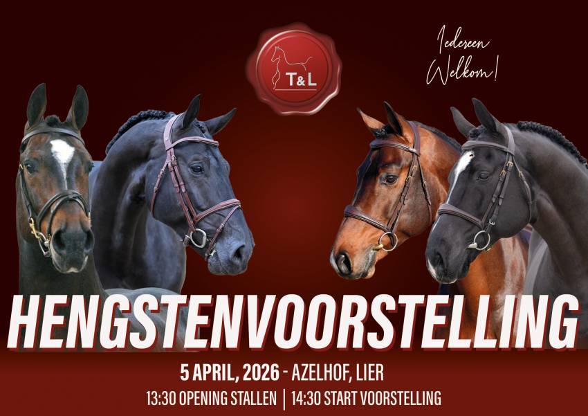 Zondag is het zover ... hengsten spotten van T&L Stables! Bij het Azelhof in Lier ontvangt het team je om de gevestigde waardes en aankomende hengsten te laten zien! Op 5 april ben je welkom...
